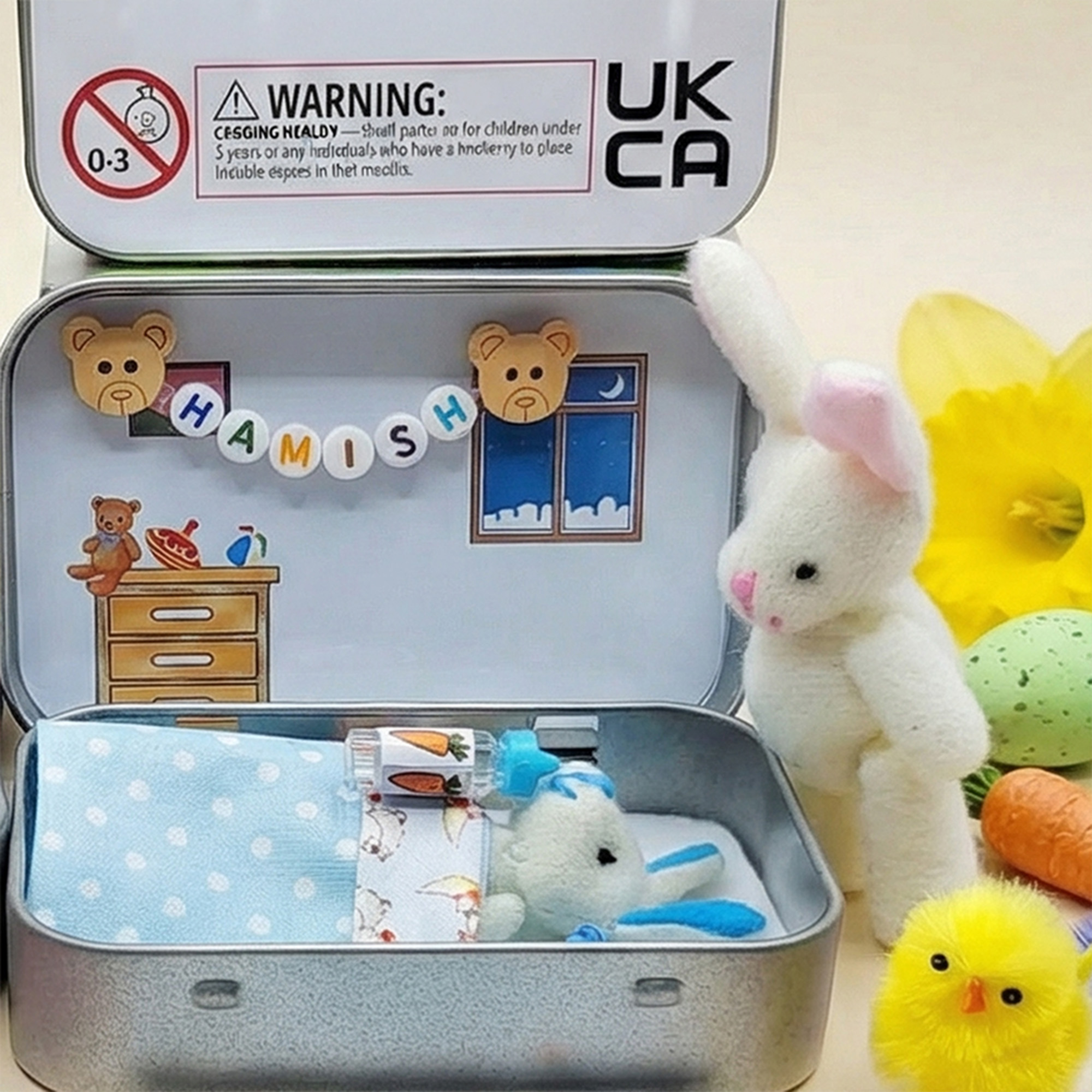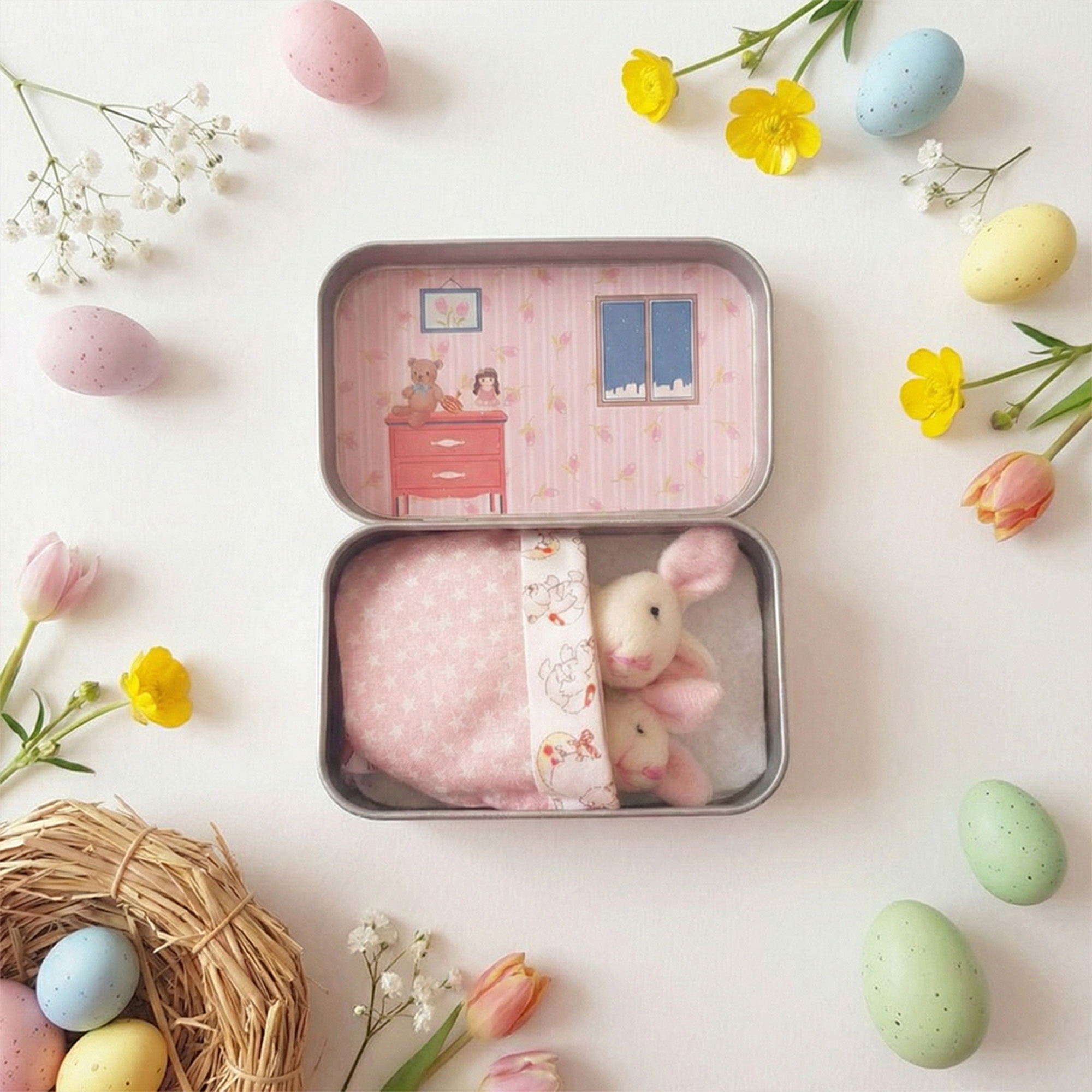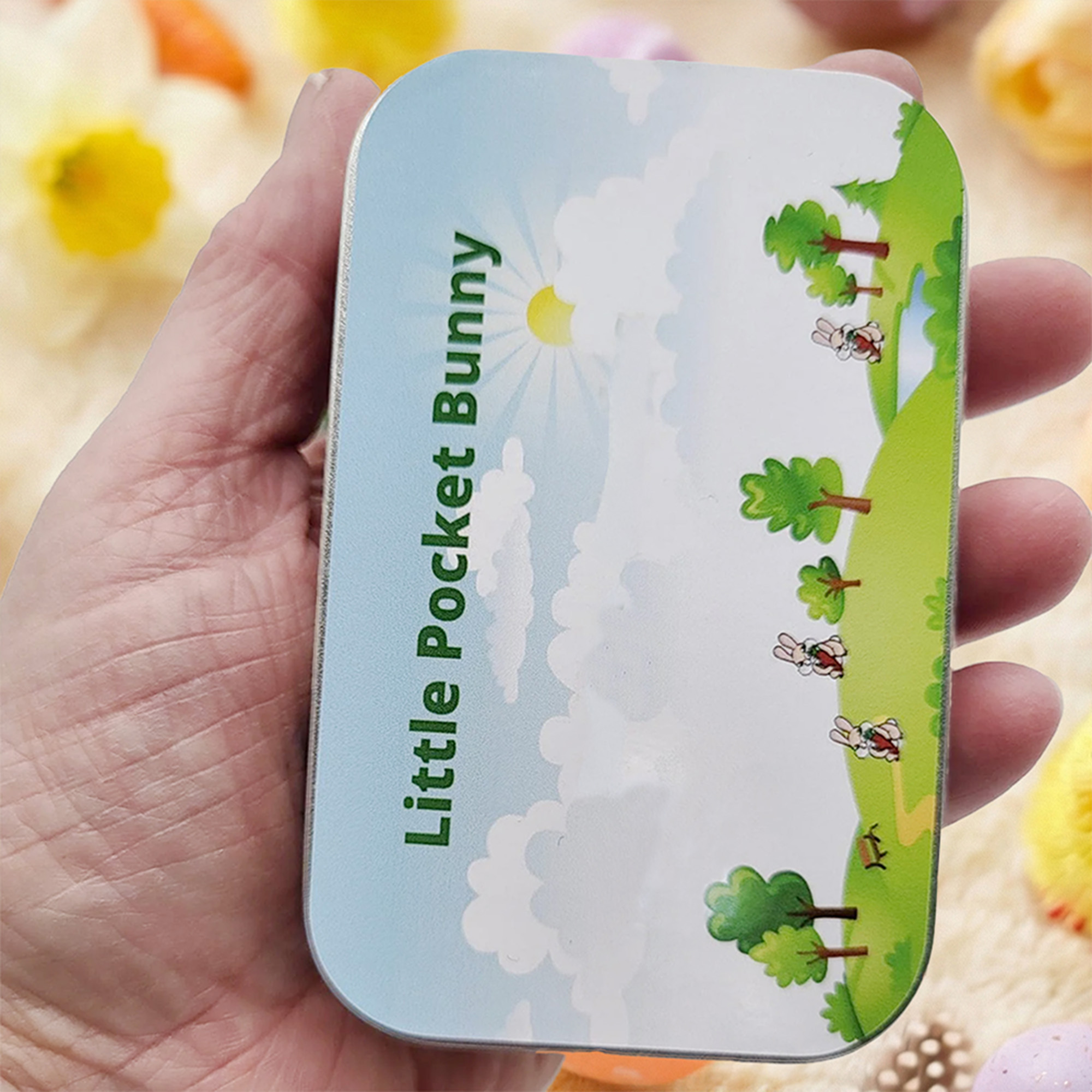 This mini tin box also includes a cute baby rabbit bottle (filled with carrot juice) and a small pacifier as accessories.