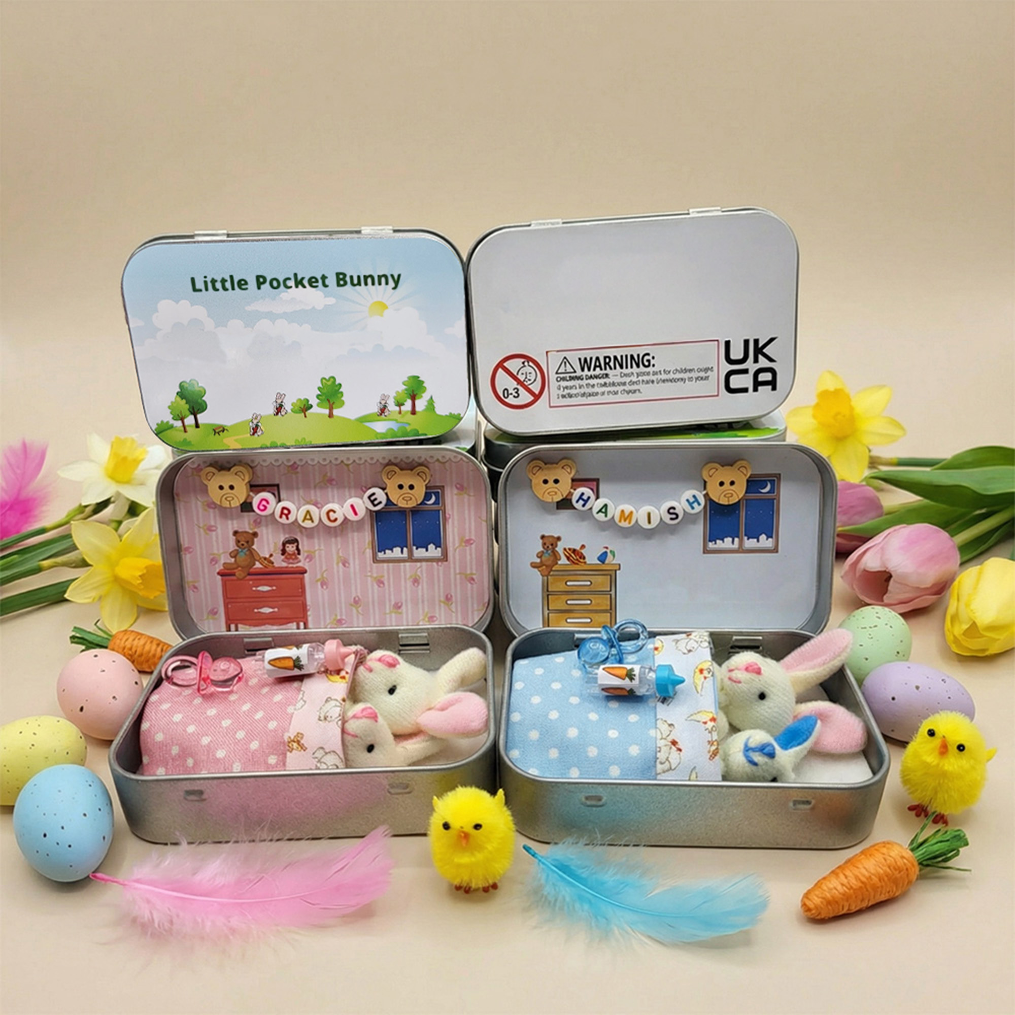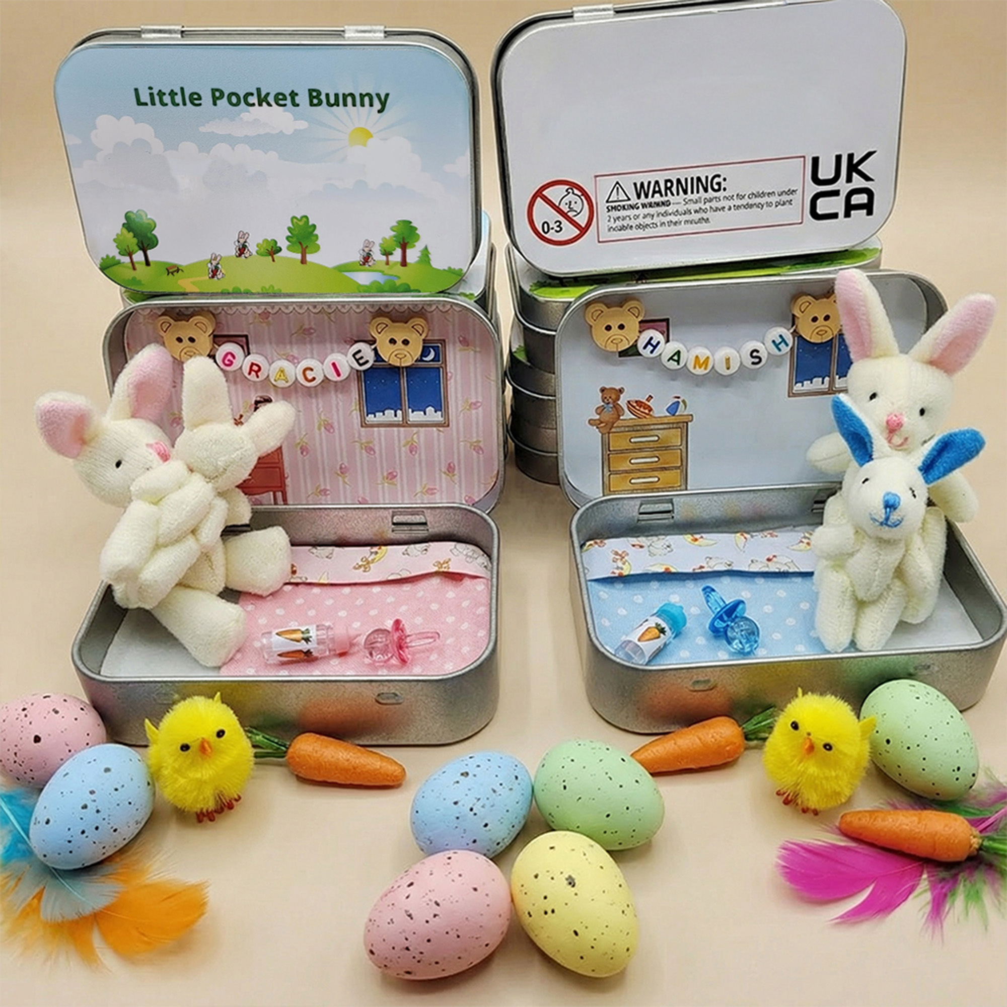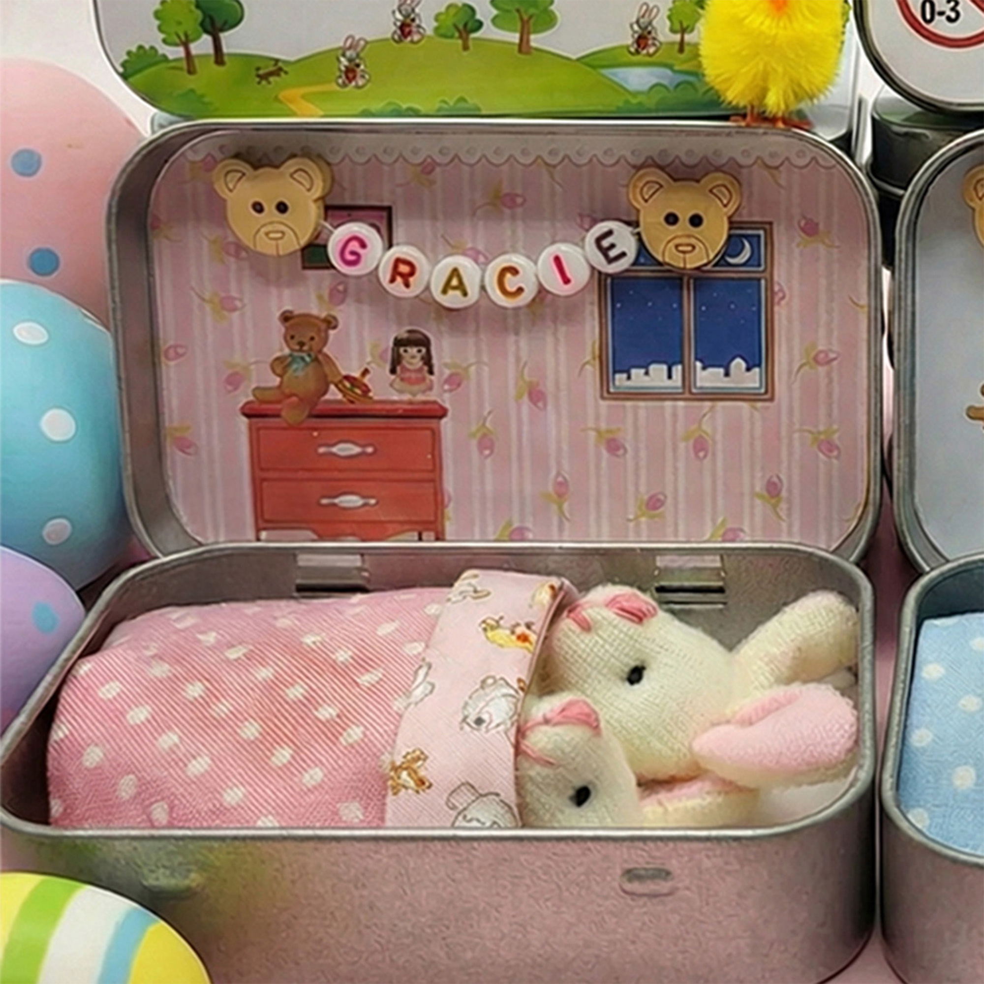 This mini tin box also includes a cute baby rabbit bottle (filled with carrot juice) and a small pacifier as accessories.
