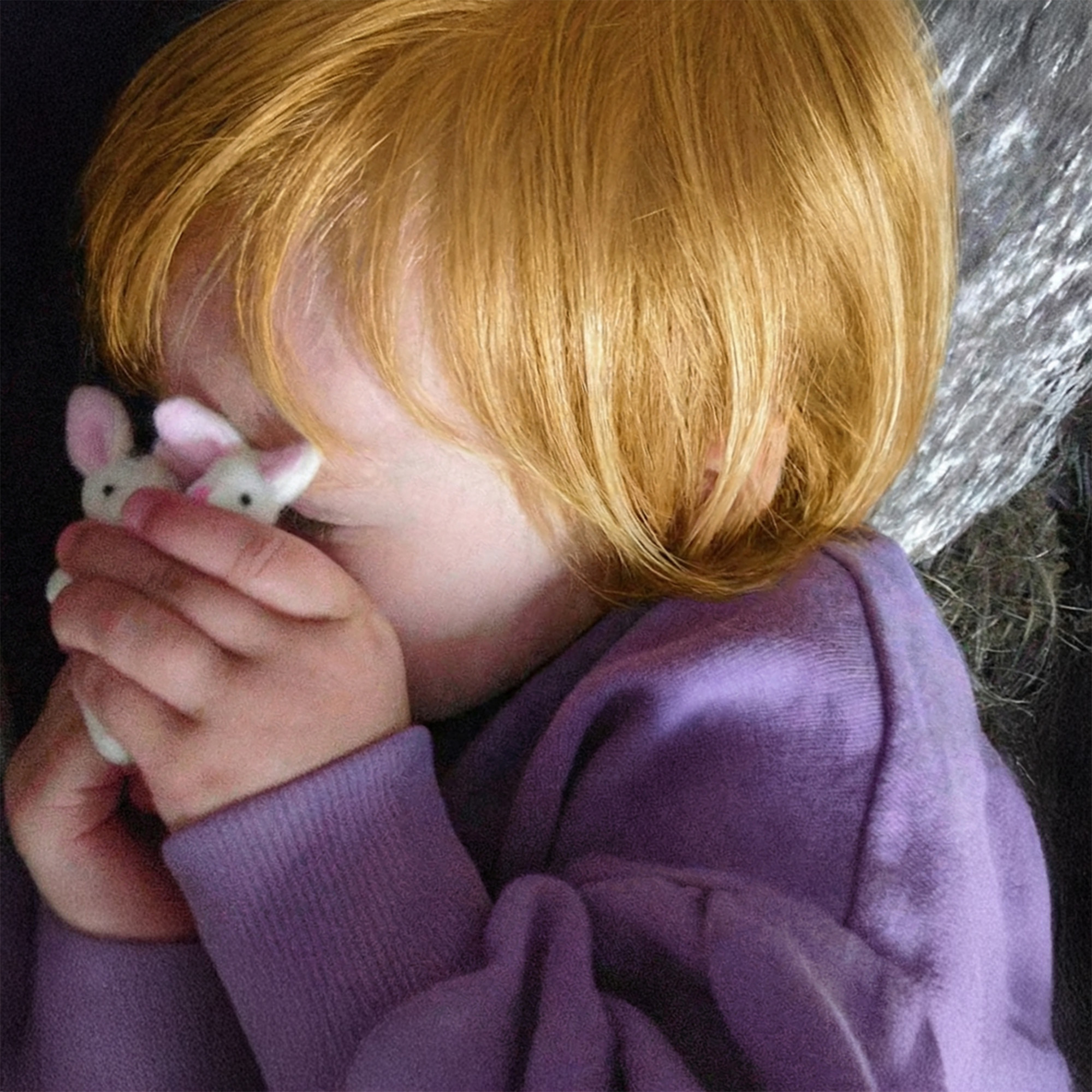 The mother and baby lie on a comfortable felt mattress, covered with a cotton blanket decorated with ribbons.
